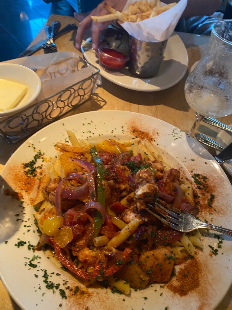 I ordered Cajun chicken and shrimp Penne, and I’ve gotta say, it was pretty good. I’m still not quite wrapping my head around these American portions, but at least I’ll have dinner for tomorrow… and maybe even the day after. Confession: may have stolen some of my friend’s fries too… They were so good. I couldn’t help it.
