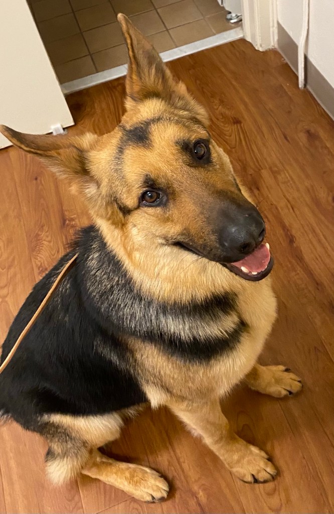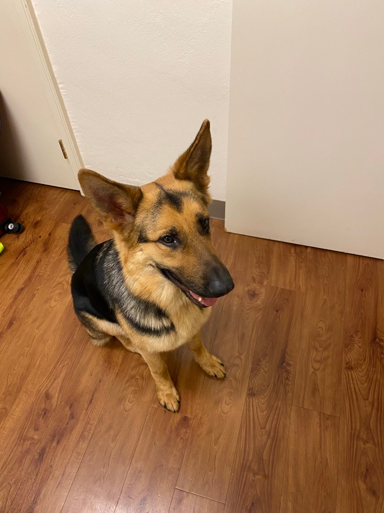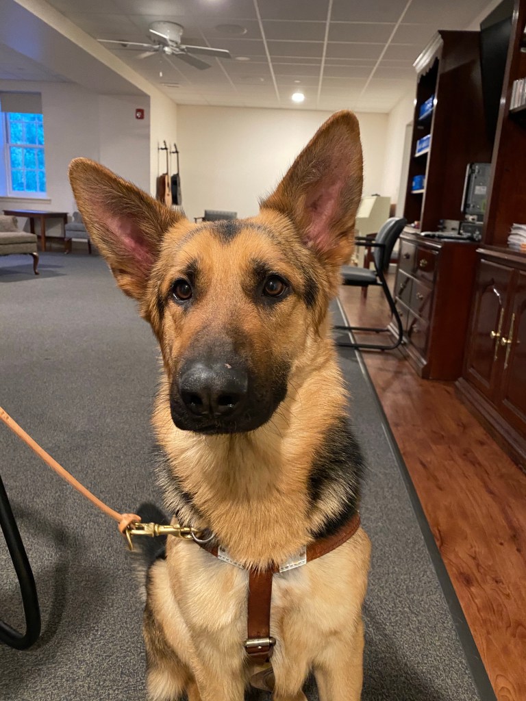 When A brought in my dog, I wasn’t really sure how to feel. I didn’t feel anxious like I thought I would, and the excitement I felt was contained under a layer of surface calm. As I was instructed, I was sitting on my bed when she walked in. This huge German Shepherd walked over to me and sniffed my legs. She introduced him to me, let’s call him W for now, and told me to clip my leash to his collar. I sat on the floor with him when she left, and he came over and licked my face. I walked him once around the room and let him get a good look at everything before showing him his new crate. He paced at the end of his leash for a bit and then sat at the door, crying. I got him interested in a new toy for a short time, but then he forgot it and resumed his lament. I understand it, to some degree. This time is stressful for these dogs, especially when considering how much change they’ve gone through already. At 7 weeks, they went to live with their puppy raisers. At a year and a half or so, they were taken from their families to come back to TSE and live in a kennel while they went through their formal training. The bonds they develop with their instructors are close and deep, and all of a sudden they’re given to this new person and the one they love most in the world ignores them so they can eventually move on and form a new bond with their human partner. If it’s stressful for me, I can only imagine how it is for them when they have no inkling as to what’s going on in their world.